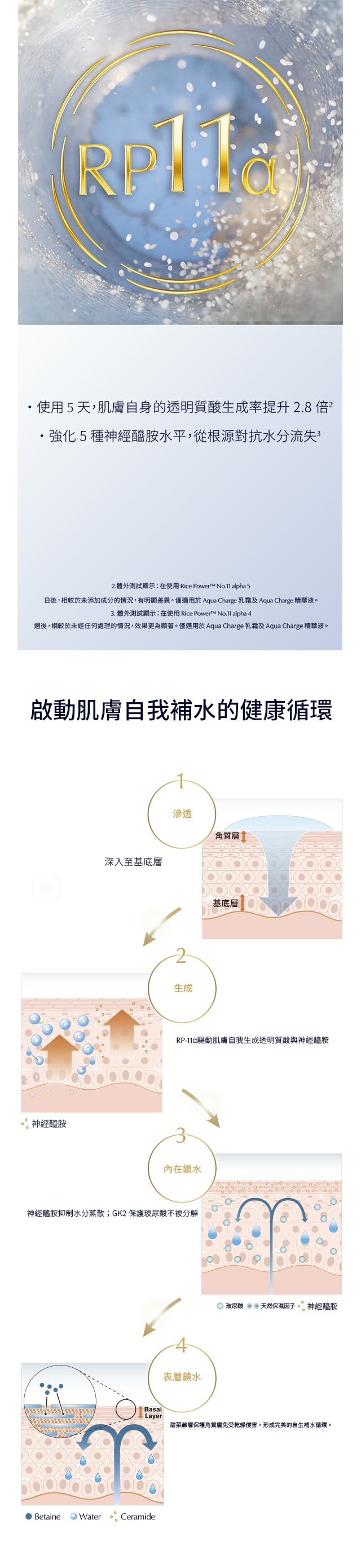 AQUA CHARGE增強肌膚自我保濕能力,重塑強韌光澤日本製造.專為亞洲肌膚研製 由內而外煥發活力光彩 專為亞洲肌膚研製 核心成分 RP‑11α —— 歷經超過 2,000 小時的高端發酵,研發出的最強保濕鎖水成分