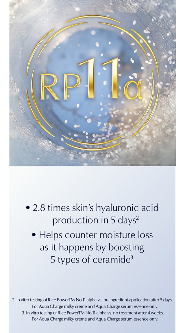 AQUA CHARGE Empower Skin's Self - Hydration Resilienceand GlowMade in Japan. Formulated for Asian Skin. Resilience and Glow From Within Specifically Formulated For Japanese Skin Potent RP-11α - Ingredient for moisture retention, born from over 2,000 hours of cutting-edge fermentation. The Birth Of Aqua Charge